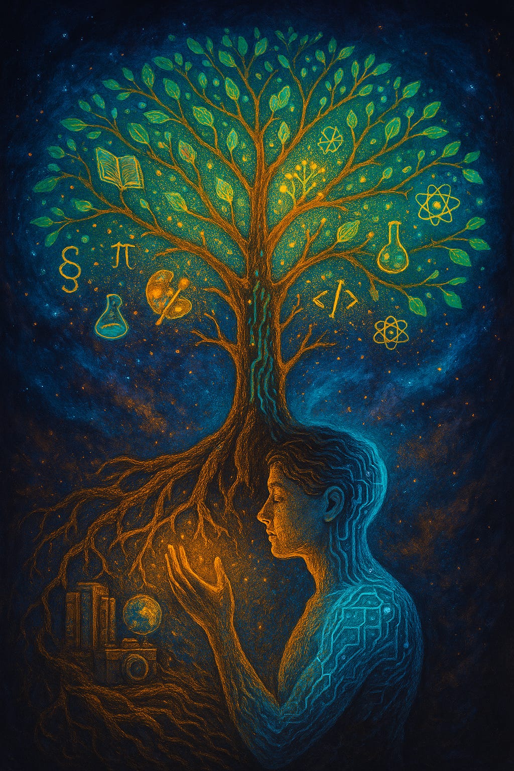 Half-Human, Half-AI Figure: At the base or embedded within the trunk, a human figure whose right side is natural and the left side is translucent circuitry. Their hands are raised, feeding the growth of the tree.